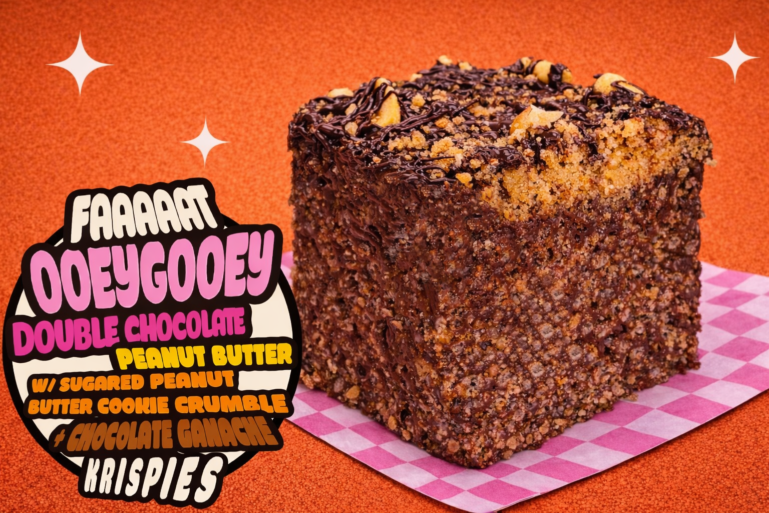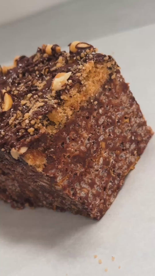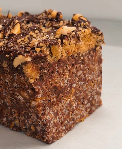 Bakery Style FAT Double Chocolate Peanut Butter Krispies w/ Sugared Peanut Butter Cookie Crumble + Chocolate Ganache • Taste like a Wunderbar
